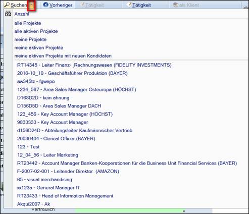 Tätigkeiten (von Kontakten, von Kandidaten) zu diesem Projekt (= erster Eintrag der Auswahlliste)