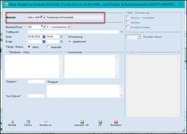 eine projekt-bezogene Tätigkeit erzeugen > Kandidat in der Kandidatenübersicht durch anklicken markieren > > es öffnet sich