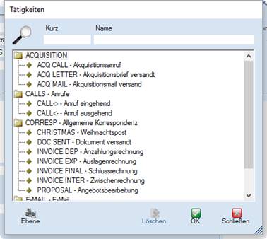 > F2 oder Doppelklick > es öffnet sich die Schlüsseltabelle aller projekt-bezogenen Tätigkeiten / Aktivitäten