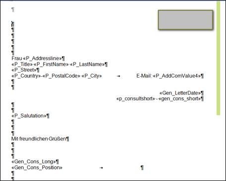 Die darin enthaltenen Serienbrieffelder / Merge Felder können kopiert werden und an anderer Stelle des Dokumentes oder in ein anderes Dokument eingefügt werden.