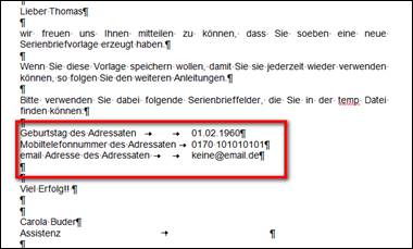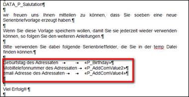 In die Serienbriefvorlagen vorher konfigurierte Textbausteine einfügen
