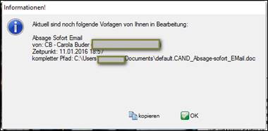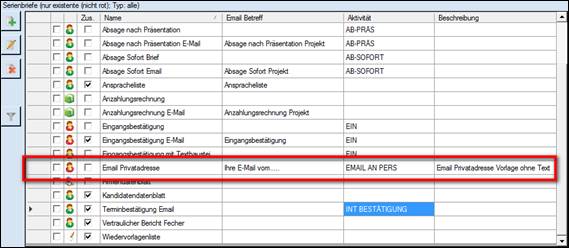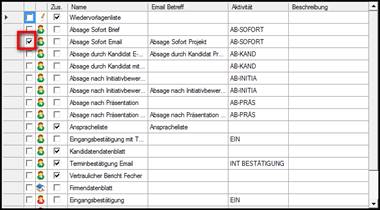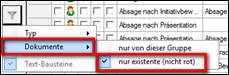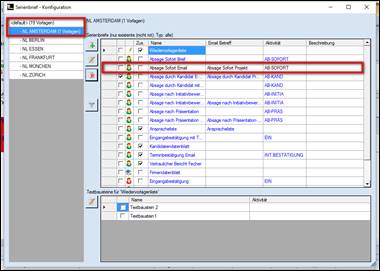 > Beispiel <default>(19 Vorlagen) = alle Dokumentenvorlagen aller Gruppen > eine farbliche Markierung (Beispiel: Absage Sofort Email), welche Dokumente auch in anderen Gruppen vorhanden sind