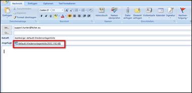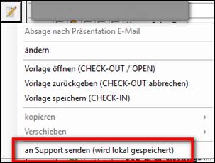 > an Support senden (wird lokal gespeichert) > der Mail Server (Outlook) öffnet sich > das Dokument wird automatisch als Anlage, an eine an den Support addressierte E-Mail gehangen