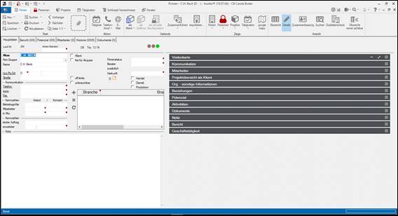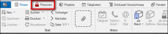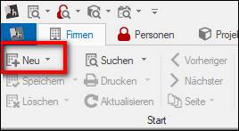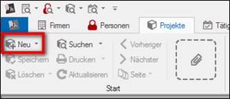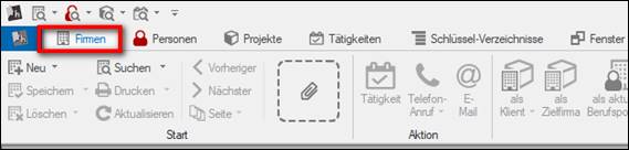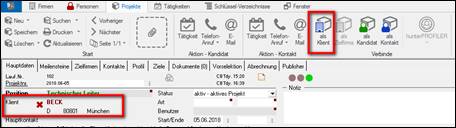 Verknüpfung zur Firmenmaske = Klient: > im Hintergrund ist die Firmenmaske des Klienten geöffnet > auf der Ribbonbar / Menue „als Klient“ > das Projekt ist mit der Klienten-Firma verknüpft