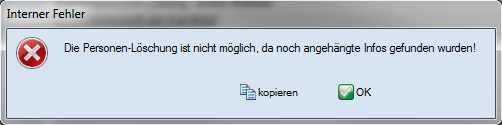 3. Sollte nun folgende Meldung erscheinen, müssen zuerst alle Verknüpfungen zu dieser Person (Arbeitgeber, Branchen, Dokumente, Tätigkeiten,…) entfernt werden, bevor die Person gelöscht werden kann!