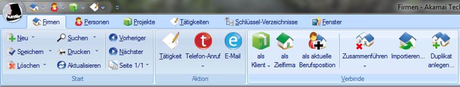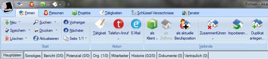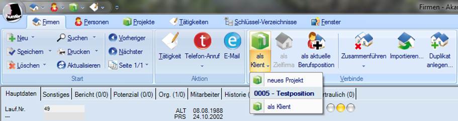 1. Um eine Firma als Klient (Auftraggeber) zu einem Projekt zu verbinden, müssen Sie die entsprechende Projektmaske im Hintergrund offen haben und im Register Hauptdaten stehen, oder durch diesen Vorgang ein neues Projekt anlegen.