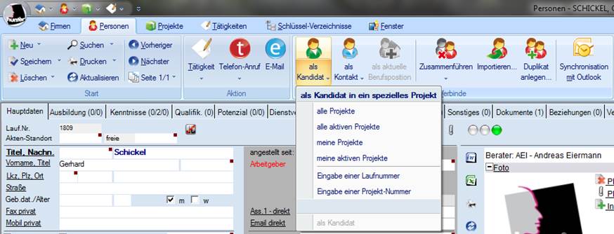 Sie eine Person als Kandidat zu einem Projekt. Die Auswahl in welches Projekt