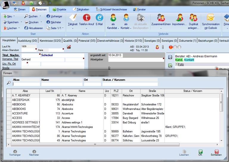 in der Personenmaske, öffnen Sie eine Auswahl an allen eingetragenen Firmen in