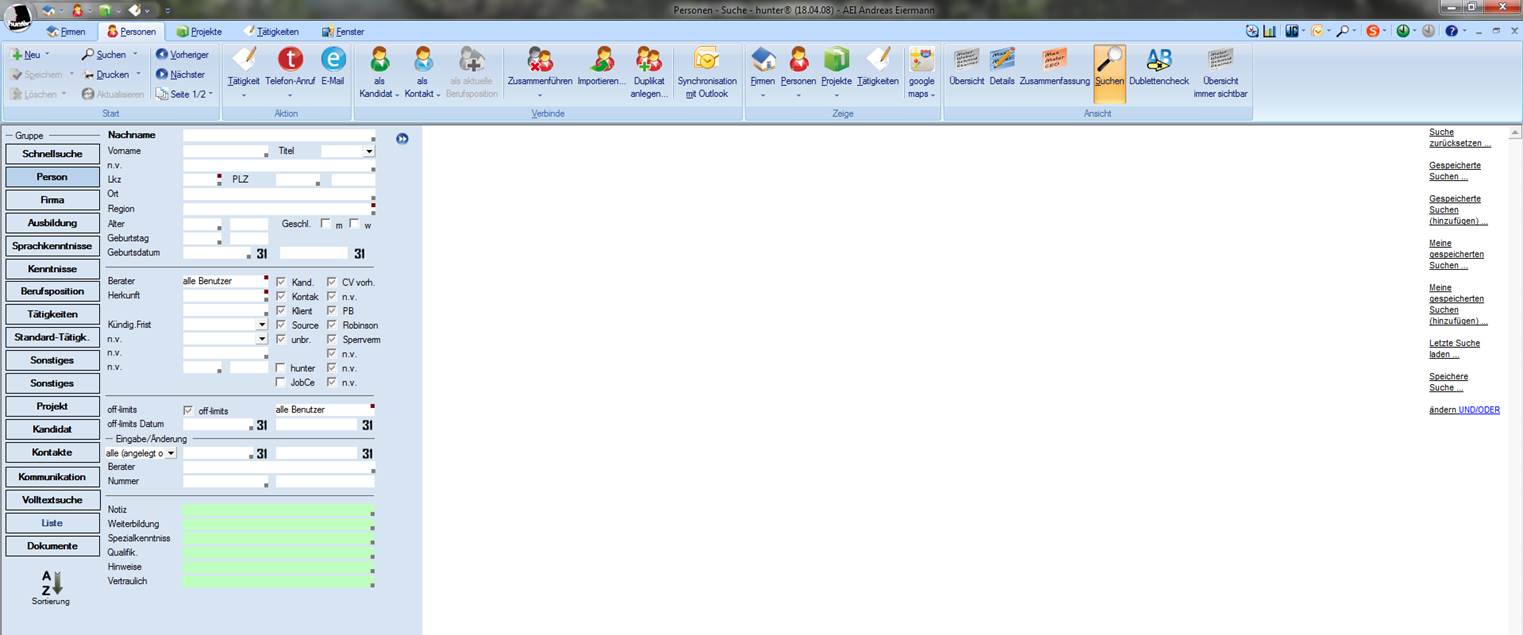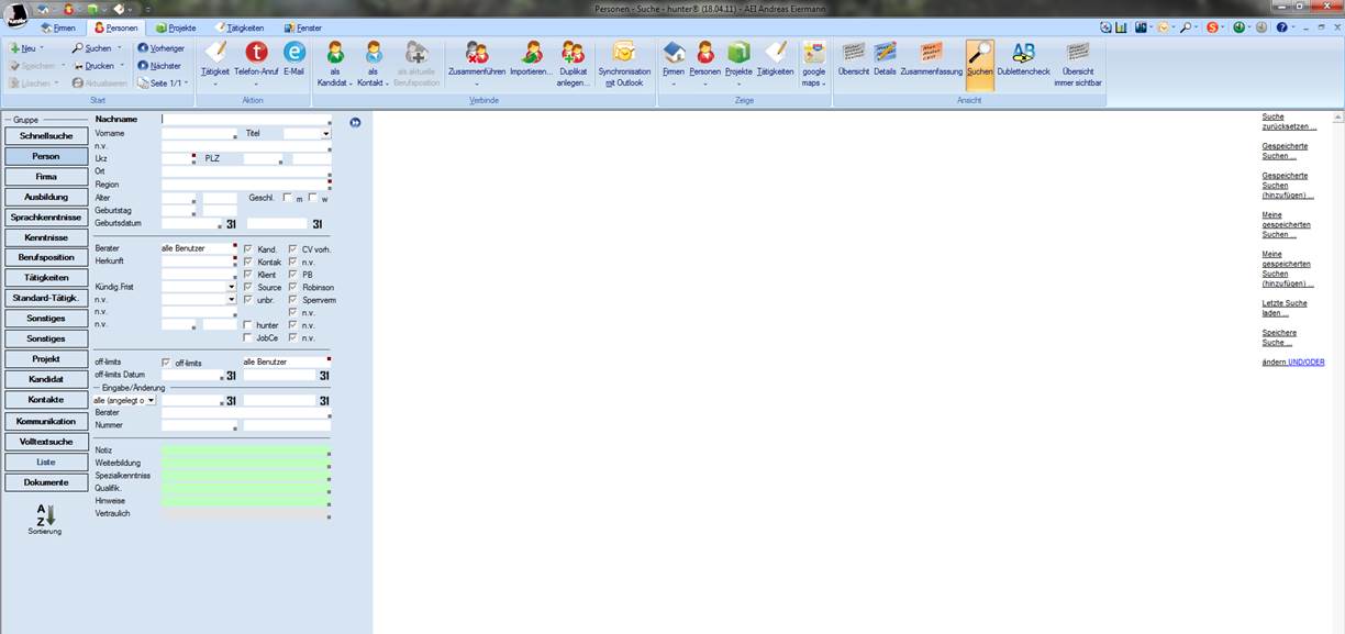 1. Die Suche im hunter Teilt sich auf den ersten Blick in zwei Bereiche auf. Die linke Seite mit den Eingabefeldern und verschiedenen Suchgruppen (Schnellsuche, Person, Firma, etc…) für die Suche und die rechte (weiße) Seite für die erweitere Suchansicht. Generell bietet die erweiterte Suchansicht