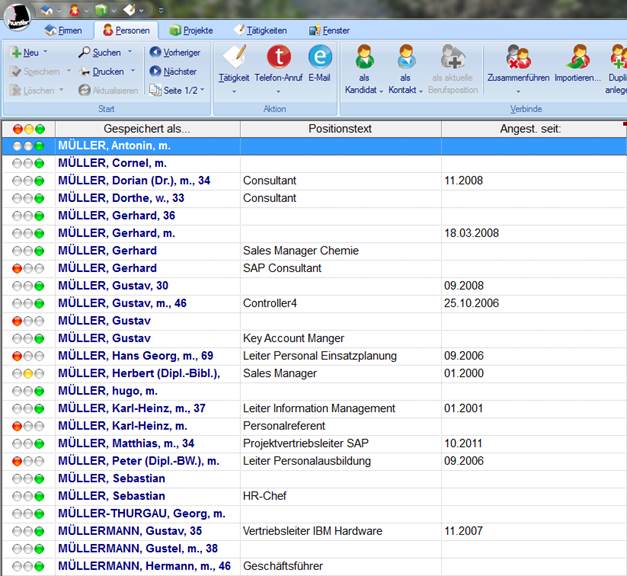 · „ähnliche“ Suche und Sortierung (Gleicher Anfang): Bei einer Suche nach Nachname Müller, werden beispielsweise auch Nachnamen Müllermann angezeigt.