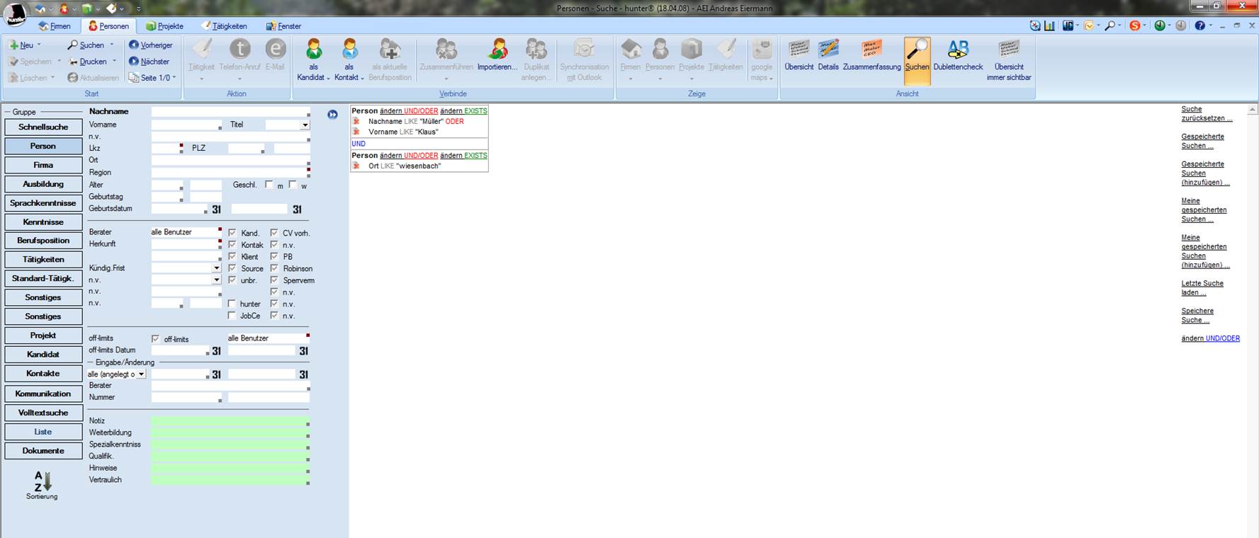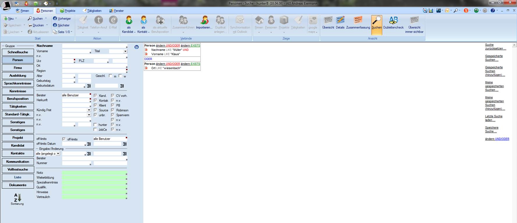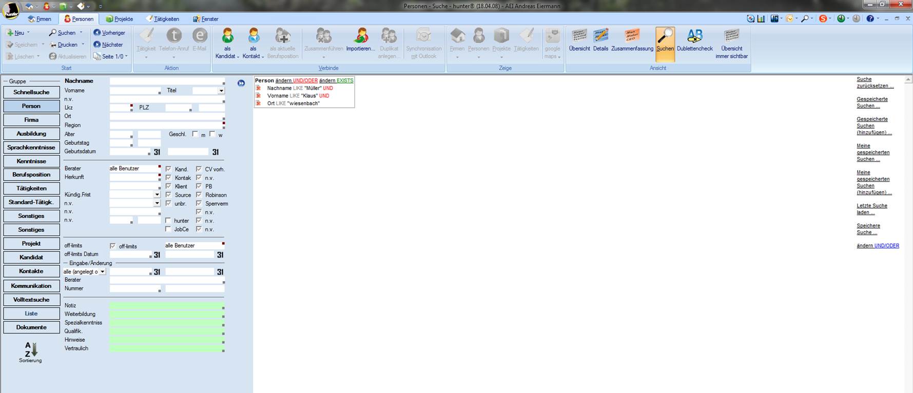 Das Suchfenster bietet Ihnen mit seinem Funktionsumfang alle Möglichkeiten, Daten in der Datenbank zu recherchieren. Je mehr Daten Sie in Ihre Suchkriterien übernehmen, desto qualifiziertere Ergebnisse erhalten Sie aus der Datenbank. Für jede der Hauptmasken gibt es unterschiedliche Suchmasken, die aber alle den gleichen Funktionsumfang bieten. Daher wird dieses Thema ausschließlich anhand der Personenmaske erläutert.