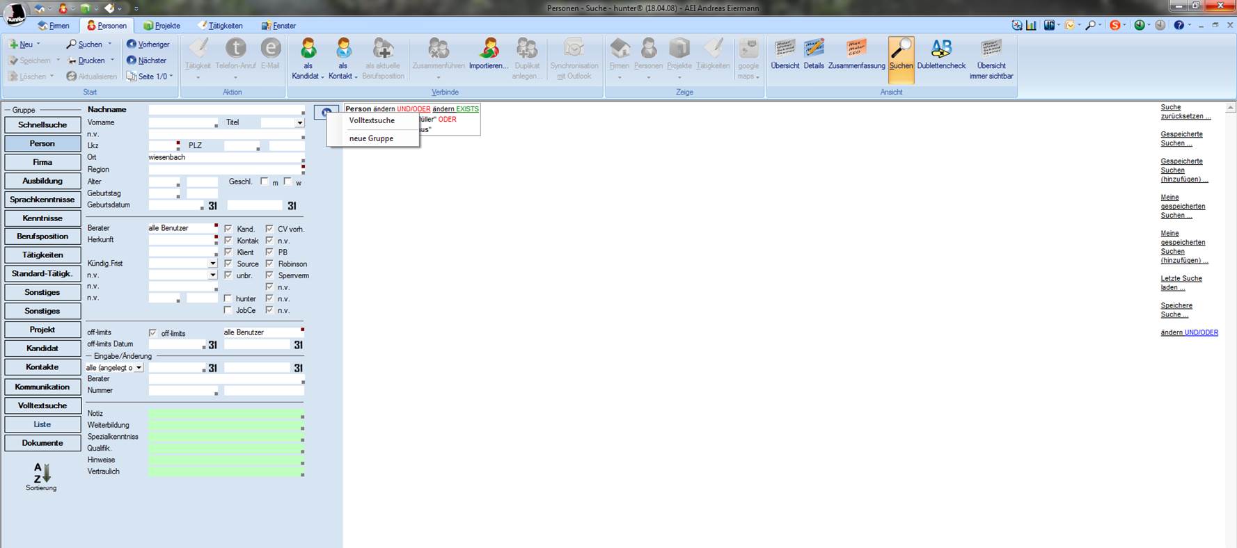 zu meiden, wenn der gesuchte Begriff in einem entsprechenden Feld im hunter steht, welches die normale Suche beinhaltet. Sollten Sie aber keine weiteren Erinnerungen an den Datensatz haben, außer dass etwas Spezielles in einem Notizfeld, oder einem