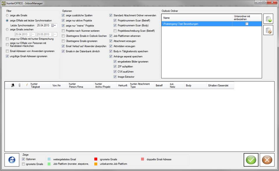 1. In der neuen Version hunter v18 wurden dem Inbox Manager drei weitere Optionen zur Verfügung gestellt. Diese finden Sie im rechten unteren Bereich unter den Optionen.