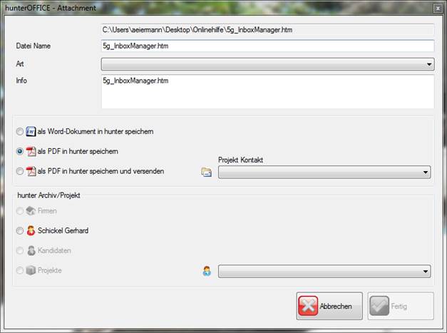 Die Dokumentenverwaltung ermöglicht Ihnen jegliches geöffnetes Dokument im hunter zu hinterlegen. Dabei haben Sie die Möglichkeit, je nachdem welche Hauptmaske Sie geöffnet haben, das Dokument zu einer Person, einer Firma, einem Kandidat, oder einem Projektkontakt zu speichern. Das Dokument muss nicht zwingend durch den hunter erzeugt worden sein (Serienbriefe, Reports, etc…), es reicht, wenn das Dokument gerade offen ist. Zudem bietet Ihnen die Dokumentenverwaltung die Funktion, offene Dokumente auch gleich an einen von Ihnen bestimmten Projektkontakt zu verschicken, je nachdem welches Projekt gerade geöffnet ist.